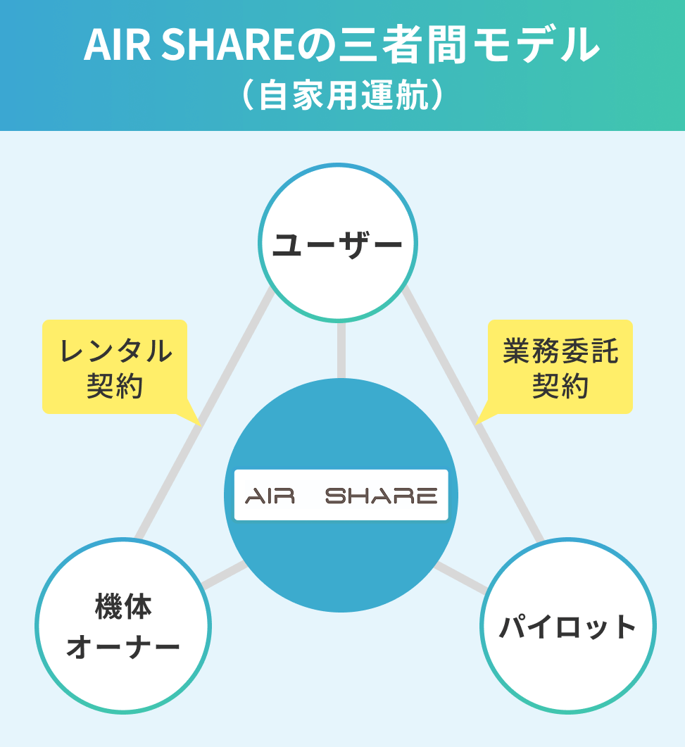 そこでエアシェアは「ユーザー」「機体オーナー」「パイロット」の3者をマッチングし、「ユーザー」が「機体オーナー」「パイロット」と個別に契約を結ぶ特許スキームを開発しました。レンタカーに専属の運転手をつけるような形式にすることで運送事業にあたらない自家用運航を実現し、出発地と目的地を指定したA地点からB地点への自由な移動が可能になりました。