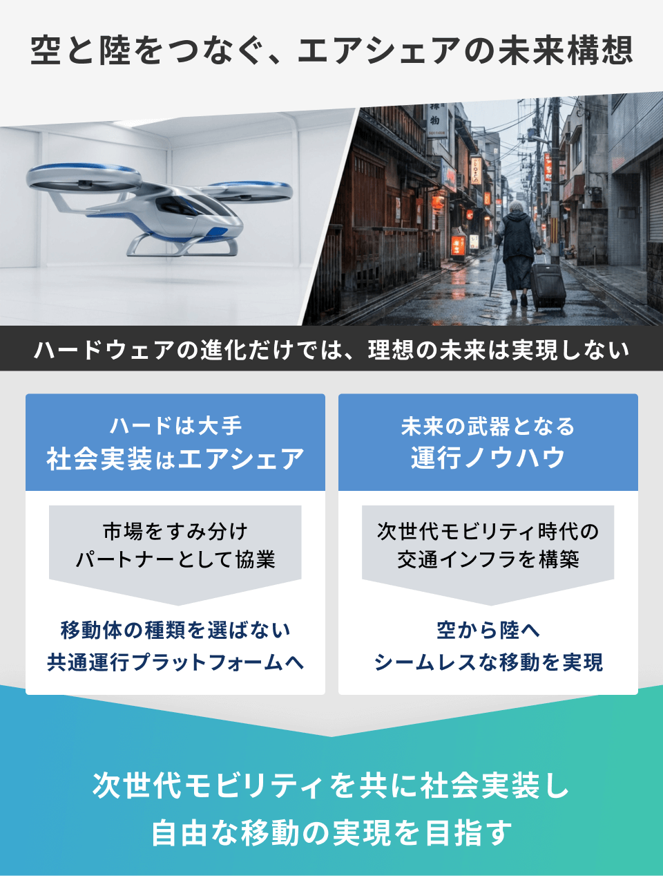 進藤:移動革命を共にする仲間を集めるための挑戦だからです。私たちが目指しているのは「空の移動」と「陸の移動」をシームレスにつなぎ、「ドア・ツー・ドアで自由に移動できる社会インフラ」を創ることです。