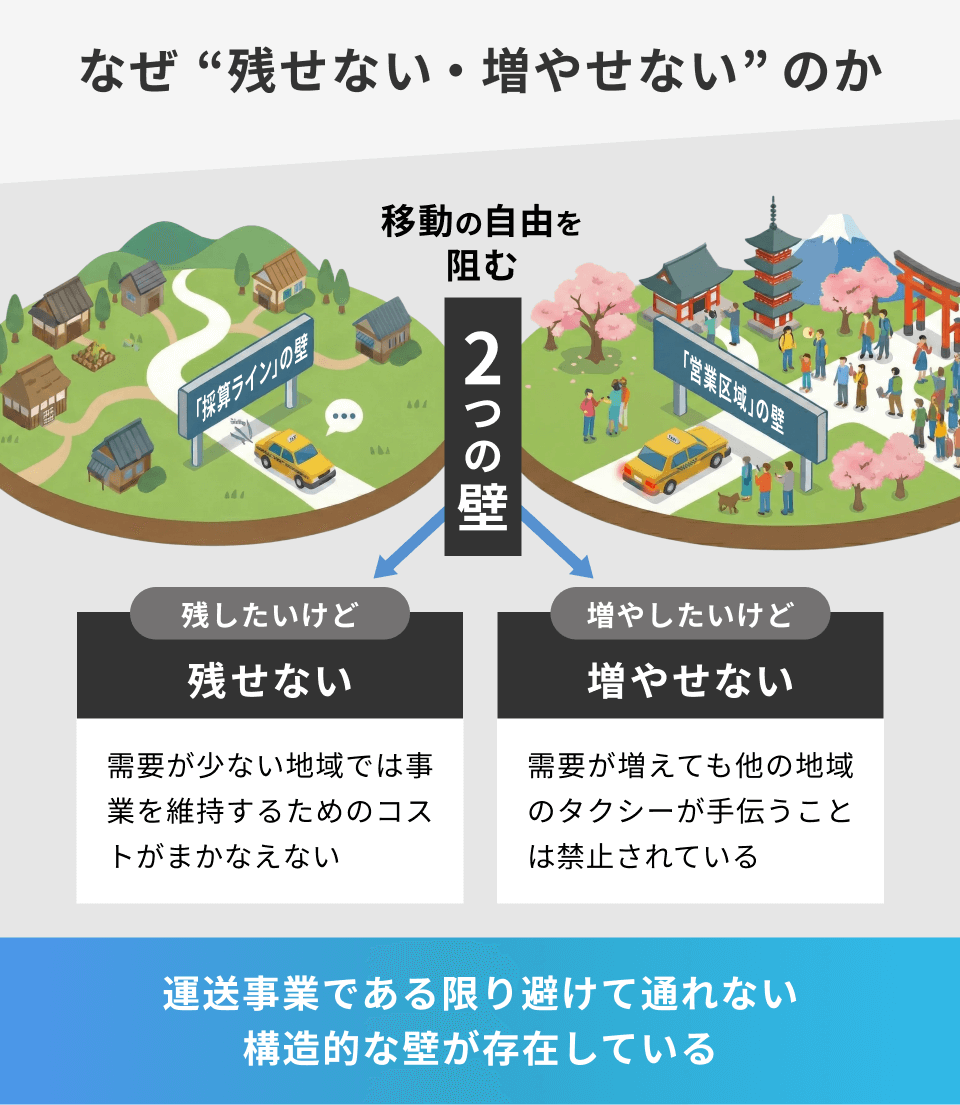 その結果、「増やしたい地域で車を増やせない」「残したい地域で事業を続けられない」というちぐはぐな状態が続き、需要に対して十分なサービスを供給できていないのです。