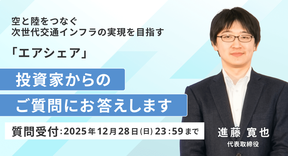 2025年12月28日(日)23:59まで、投資家の皆さまより「株式会社エアシェア」へのご質問を受け付けます。