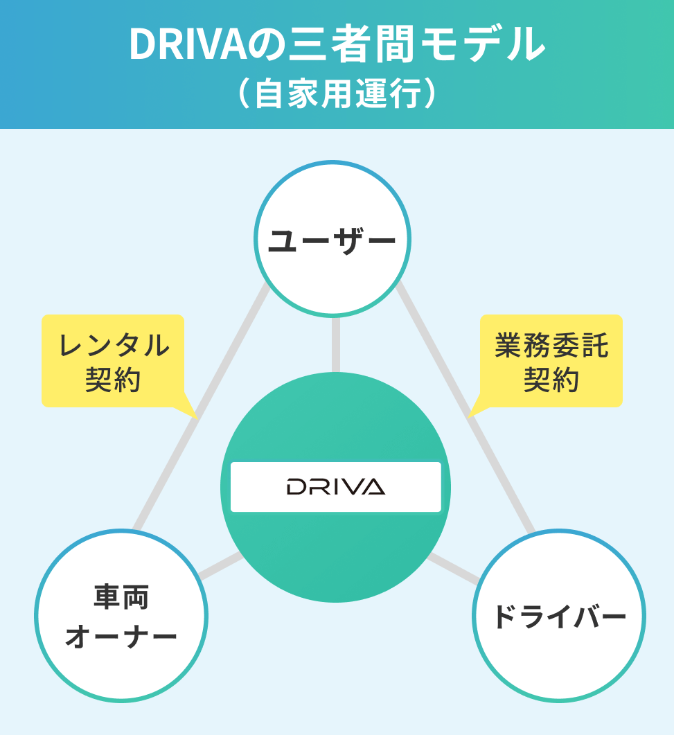 従来の法律では、許可なく自家用車で人を運んで報酬を得ると「白タク行為」として違法になります。そこでDRIVAはプラットフォーム上で「ユーザー」「車両オーナー」「ドライバー」の3者をマッチングし、ユーザーが「車両オーナー」および「ドライバー」とそれぞれ個別に契約を結ぶスキームを採用しました。
