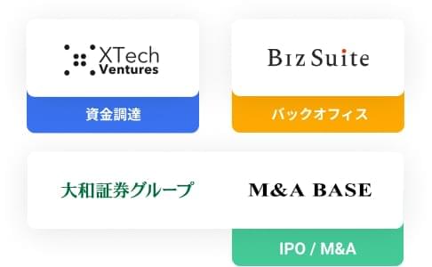 イークラウドのグループ会社には、ベンチャーキャピタル・M&A支援・バックオフィス業務支援を行う会社があります。また、大和証券グループとも連携しているため、 創業初期(シード)の資金調達から、IPOやM&Aするまでワンストップ でサポートを行えます。