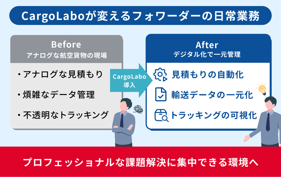 これからのフォワーダーに求められるのは、単なる手配作業ではなく、有事の際に瞬時に代替ルートを組み直すような“プロフェッショナルな課題解決”です。CargoLabo社は、フォワーダーをデータ入力や予約手配といった単純作業から解放し、人間にしかできない高度なトラブルシューティングに集中できる環境を整備することが急務と考えています。