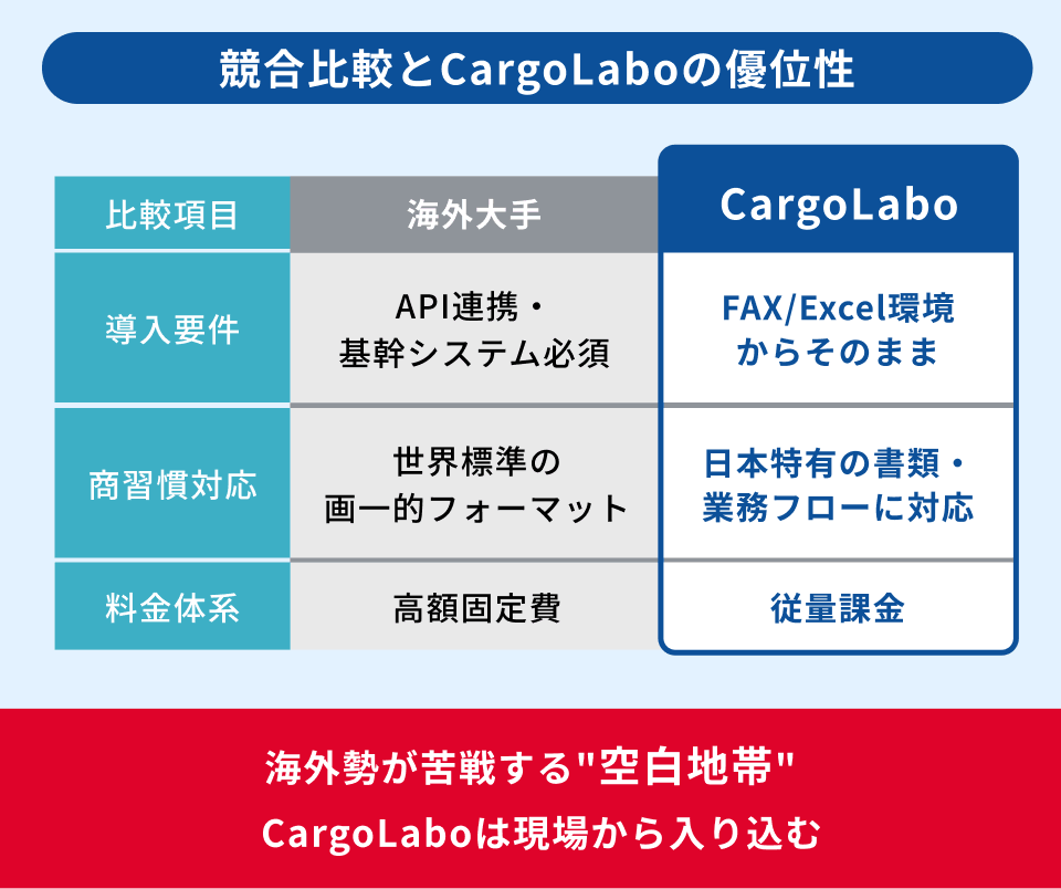 グローバル市場には「cargo.one」や「WebCargo」といったサービスが存在しますが、日本の中小フォワーダーにとってはコスト・機能要件の両面で導入ハードルが高いと認識しています。それに加え、日本の物流現場には海外製ツールでは対応が難しい独自の商慣習が存在します。