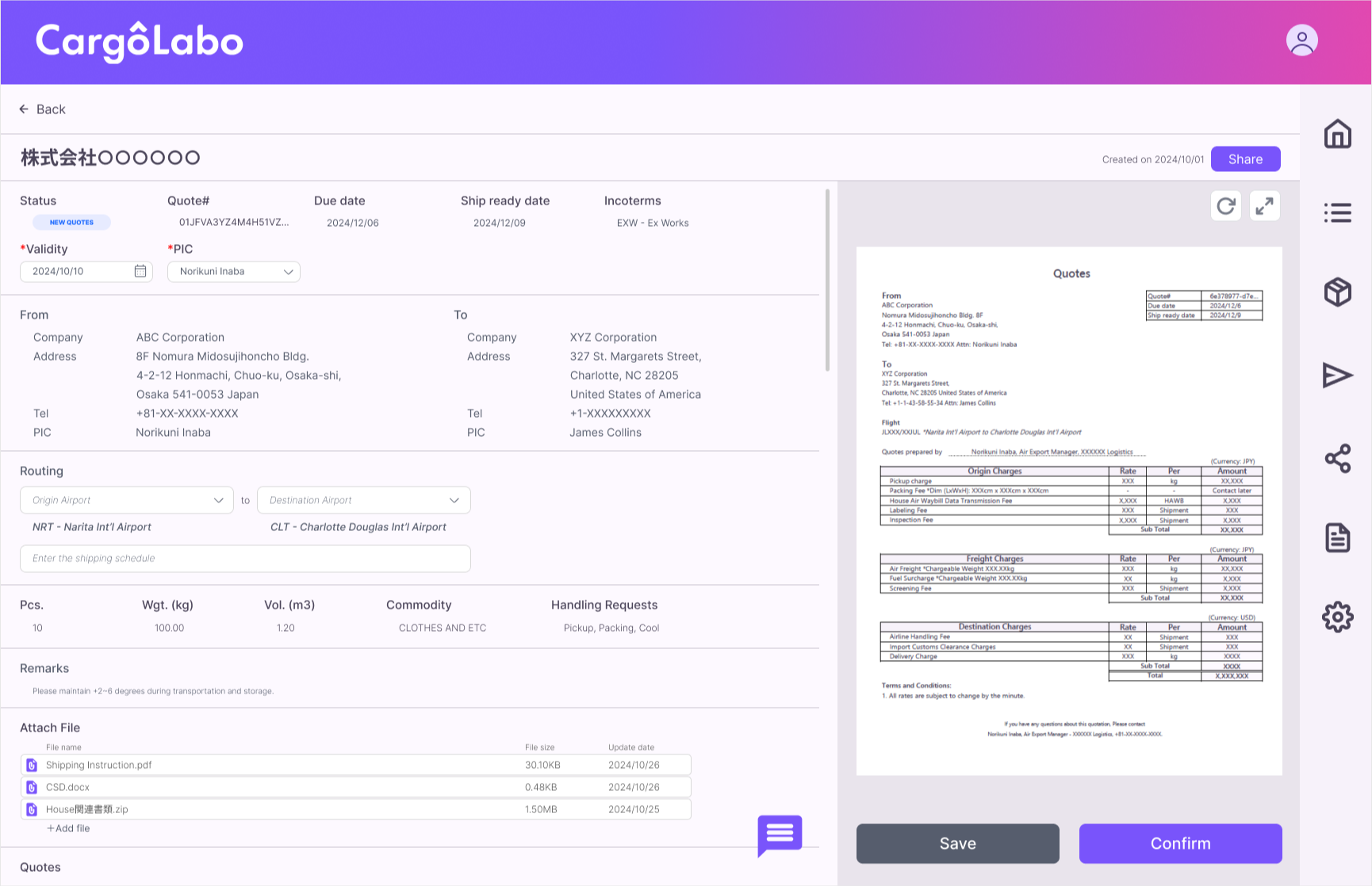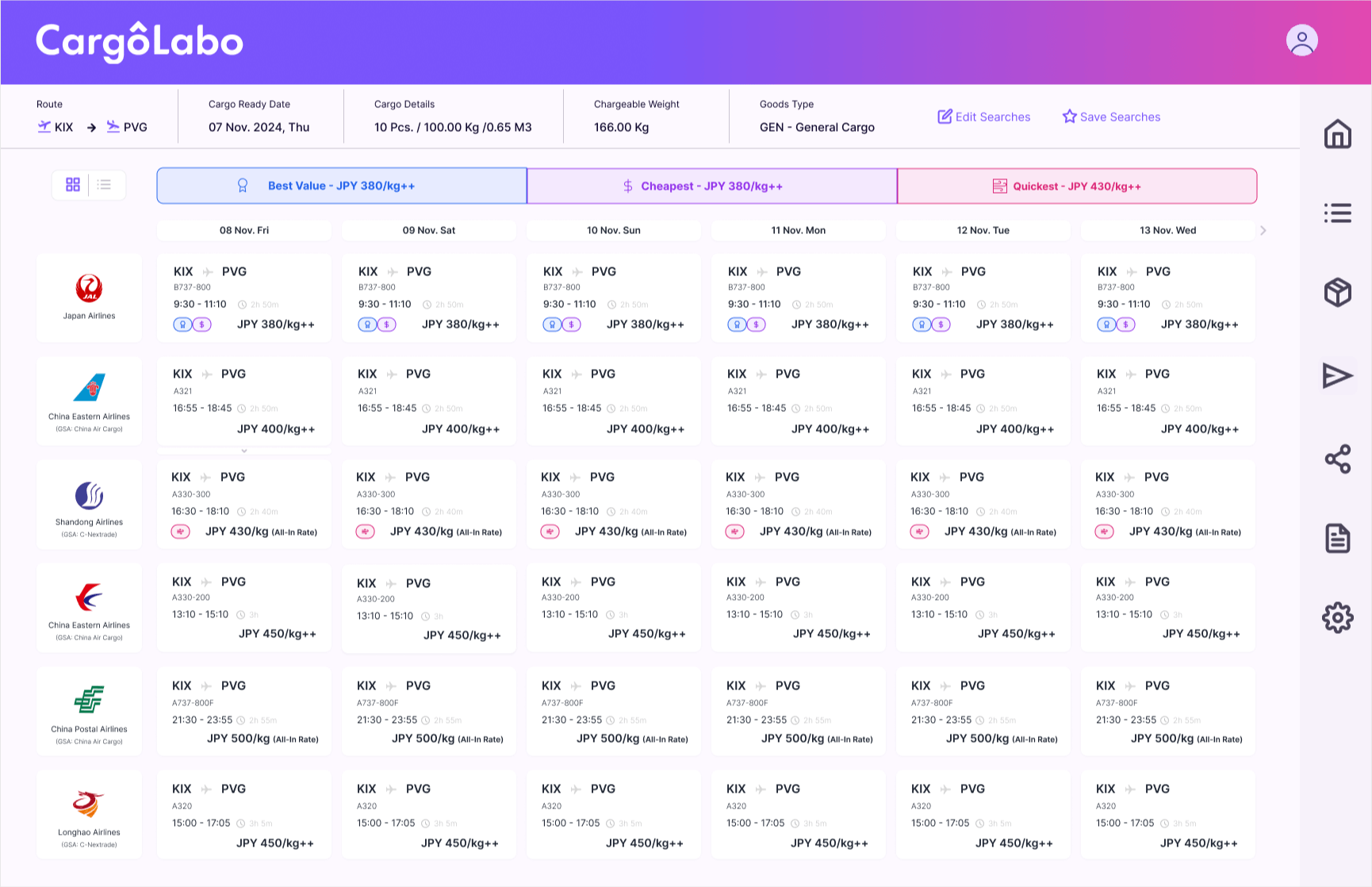 蓄積された過去の取引データをもとに、見積もり作成時の最適レートを自動提案。担当者を手作業での料金検索や比較から解放します。CargoLabo社によればフォワーダー各社では1日の見積もり依頼のうち相当数に即時対応できず機会損失が生じており、本機能はその損失の最小化を目指すものです。