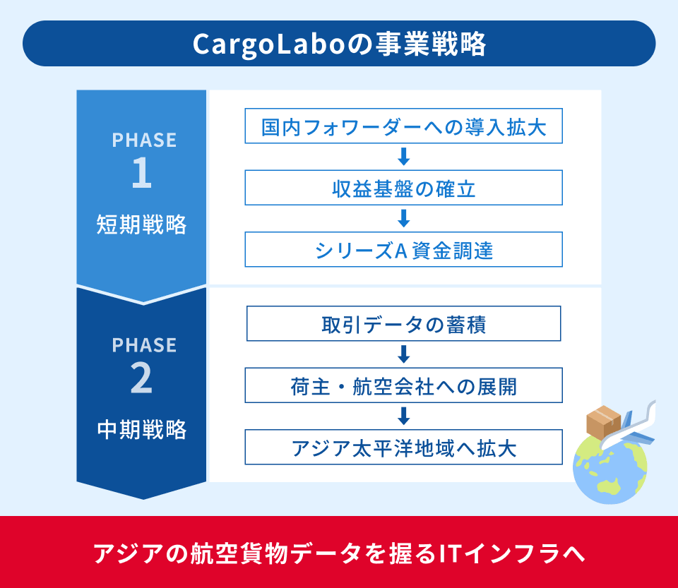 現在はまず足掛かりとして、フォワーダー向けに貨物追跡・見積もり作成・書類管理を一つの画面で一元管理できるクラウドシステムを提供しています。同社はこのフォワーダー向けのシステム導入を起点として、その先にいる荷主へと利用を拡大し、最終的には航空会社をもプラットフォームに取り込んでいく戦略を描いています。